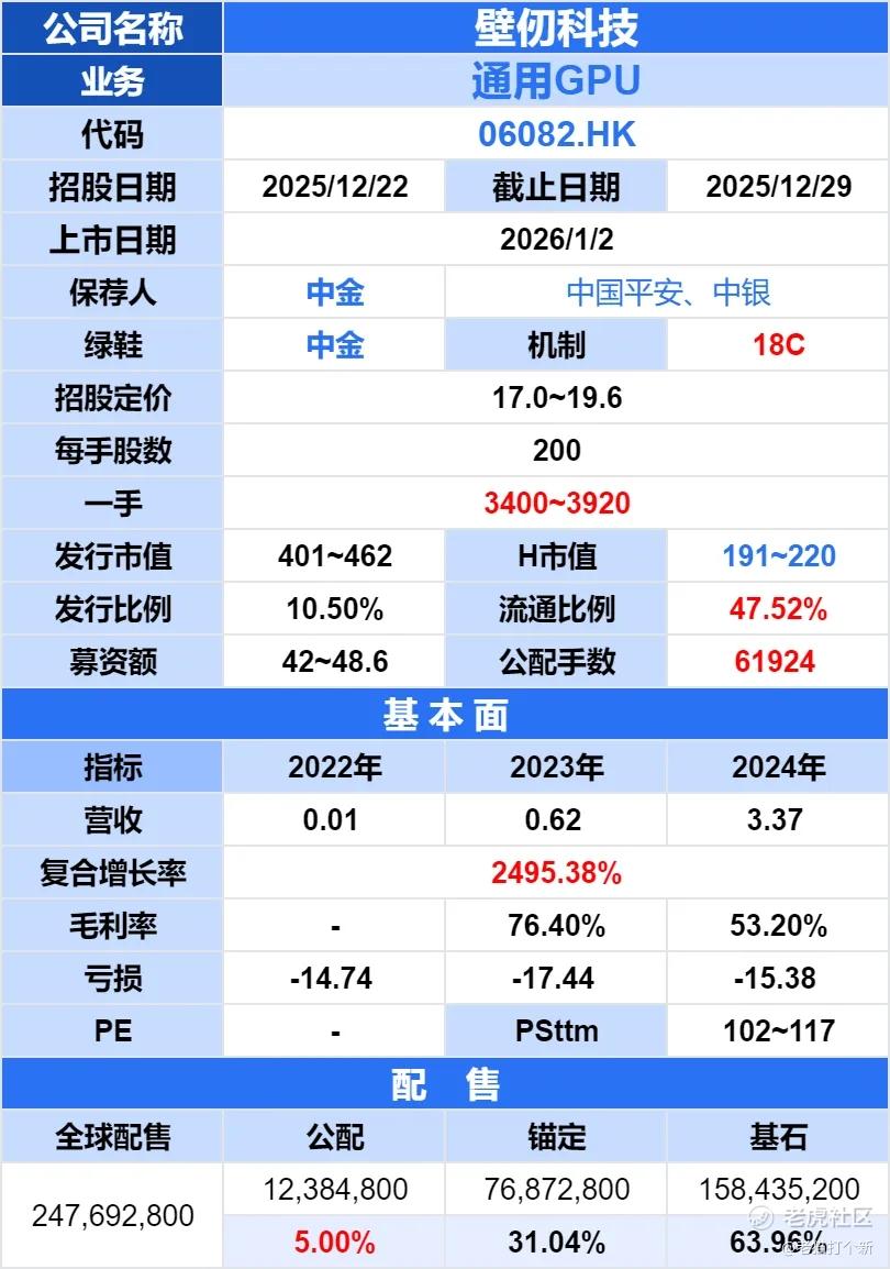 如上图,壁仞可以说不贵,25FY营收取8.2亿订单~12.4亿销售合同中值10亿算,46倍PS也就比海光、景嘉微贵一些,就算25FY只赚了5亿,92倍PS也就寒武纪、**一个档次的,比之前热闹上市的摩尔、沐曦要便宜的多,大肉!就算6万手货很多,热度估计也不小,中签率得看最终孖展。