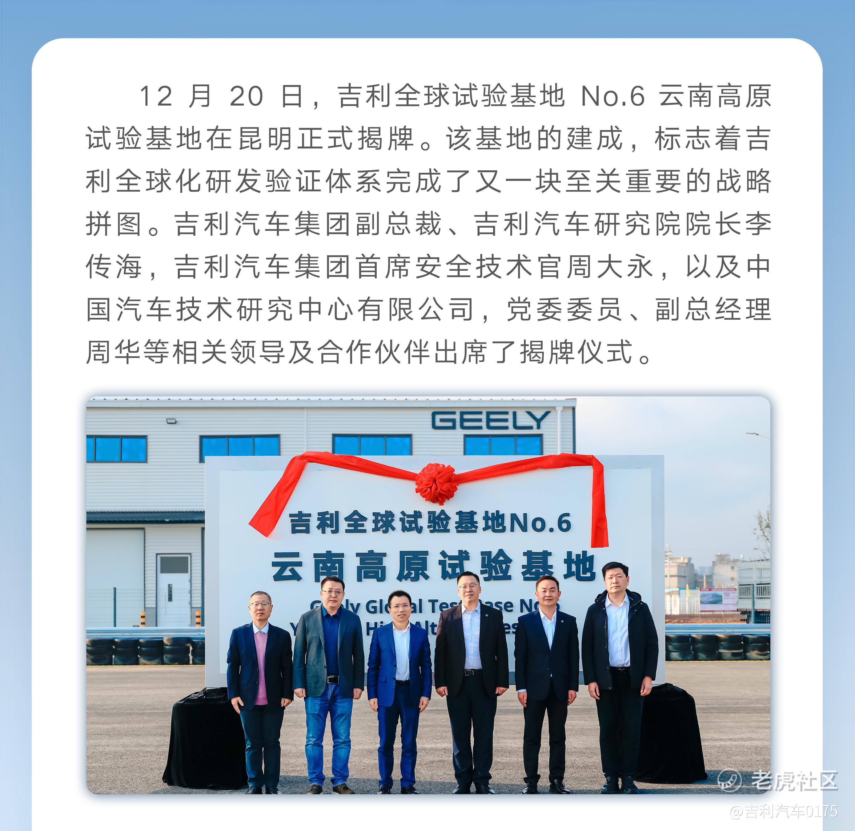 12月20日,吉利全球试验基地 N0.6云南高原试验基地在昆明正式揭牌。该基地的建成,标志着吉利全球化研发验证体系完成了又一块至关重要的战略拼图。