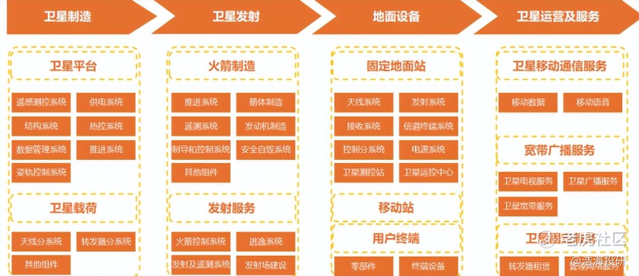 如果把卫星互联网的产业链打开,你会发现其产业链主要包含了卫星制造、卫星发射、地面设备、卫星运营及服务四大环节,每个环节的行业特点和竞争格局不尽相同。