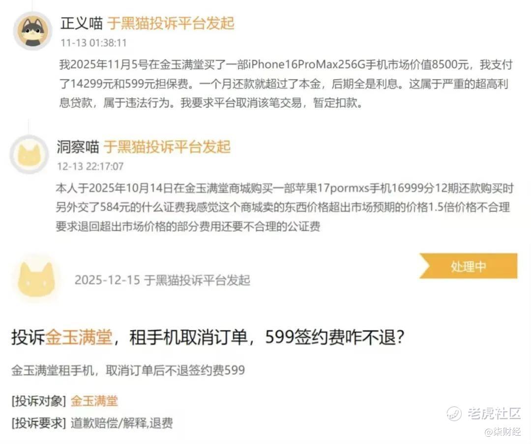 无独有偶,这位用户也遇到了相同的情形:2025年11月5号在金玉满堂买了一部iPhone16 Pro Max 256G手机,市场价格8500元,我支付了14299元和599元担保费。一个月还款就超过了本金,后期全是利息。这属于严重的超高利息贷款,属于违法行为。要求平台取消该笔交易,暂定扣款。