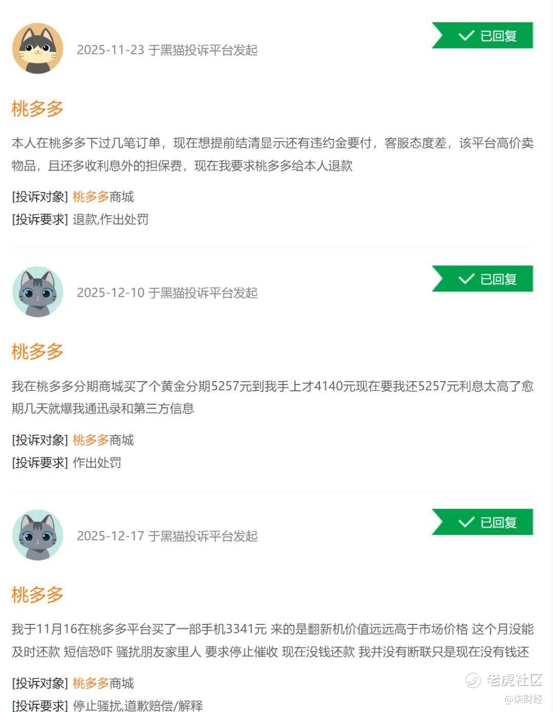 比如,有上百位用户投诉桃多多分期商城:高价卖物品,且多收利息外的担保费;买到翻新机,价值远远高于市场价格,没能及时还款,短信恐吓,骚扰朋友家里人;在桃多多分期商城买了个黄金分期5257元,到手上才4140元,利息太高,愈期几天就威胁爆通迅录和第三方信息。