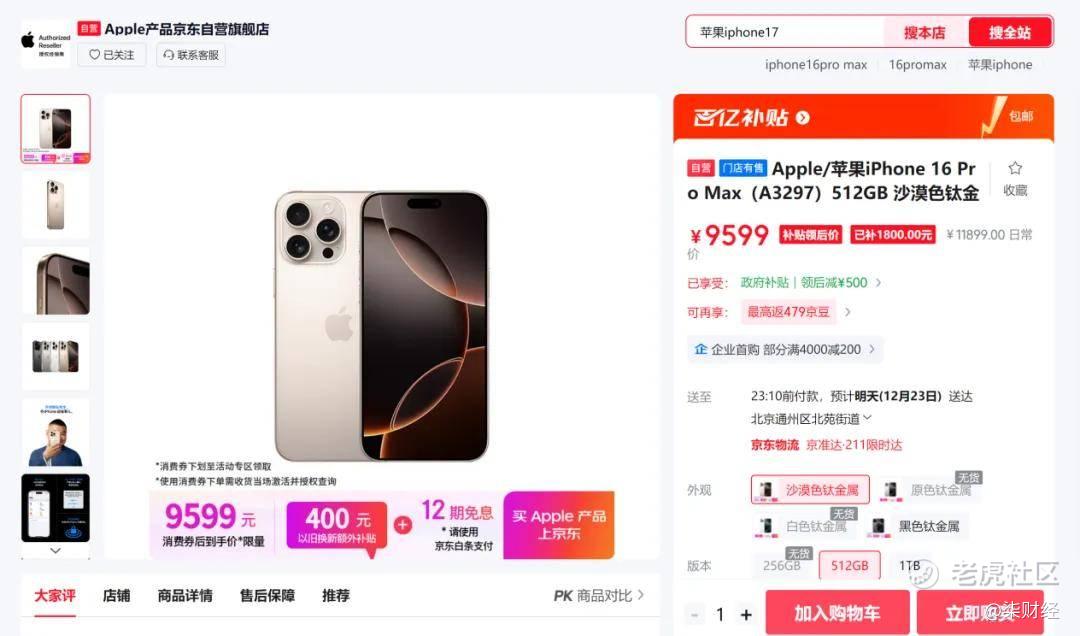 然而,同日京东Apple自营旗舰店里,沙漠色钛金属外观的iPhone 16 Pro Max,且存储容量是更大的512G,仅售9599元。