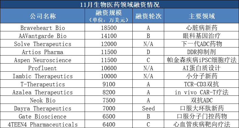 前沿技术路线与新靶点受到关注:11月,诺奖得主创办的in vivo CAR-T药物公司Azalea、分子胶公司Quarry Thera、分子门控药物公司Gate Bio等前沿技术企业均获得大额融资。