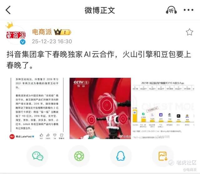 有媒体透露火山引擎将成为2026年中央广播电视总台春节联欢晚独家AI云合作伙伴,抖音旗下的智能助手豆包也将配合上线多种互动玩法。