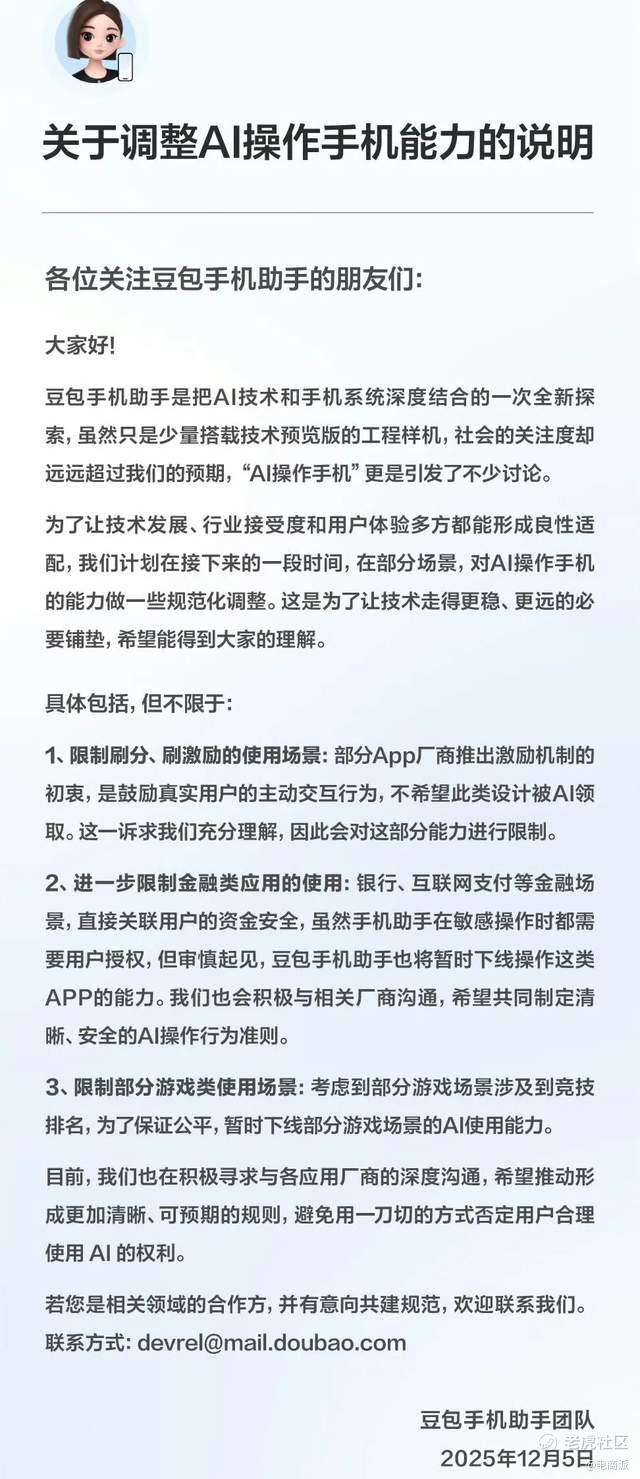 面对种种争议,豆包接连发出声明澄清。12月5日,豆包手机助手发文称进一步限制金融类应用的使用,“银行、互联网支付等金融场景,直接关联用户的资金安全,虽然手机助手在敏感操作时都需要用户授权,但审慎起见,豆包手机助手也将暂时下线操作这类APP的能力”。