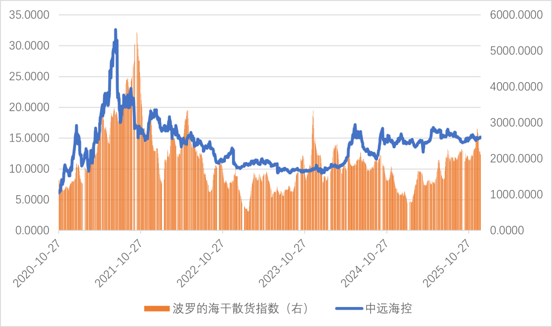 航运,是一个周期性特别明显的行当。但我们把中远海控与波罗的海干散货指数进行关联时,二者存在强相关性。当然股价用的是不复权的价格。