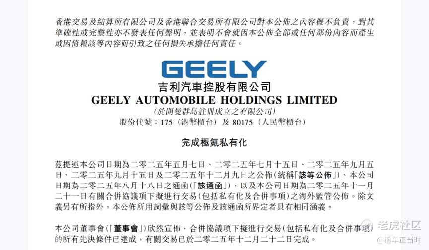 12月22日,吉利汽车发布公告,宣布正式完成极氪智能科技控股有限公司私有化及合并事项的交易,极氪已成为吉利汽车的全资附属公司,并于纽交所退市。