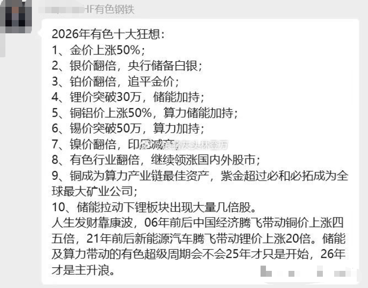 至于长期投资价值,之前各大行机构已经给出了黄金2026年目标价,看涨极值差不多是摩根大通的5500美元。昨天看到了某国内有色分析师给的明年“狂想”——黄金6600美元、银铂翻倍、锂价翻倍、……有色翻倍、锂电产业链出现大量几倍股。核心理念:个人能力决定下限,康波决定上限,要抓住时代红利~[眼眼]