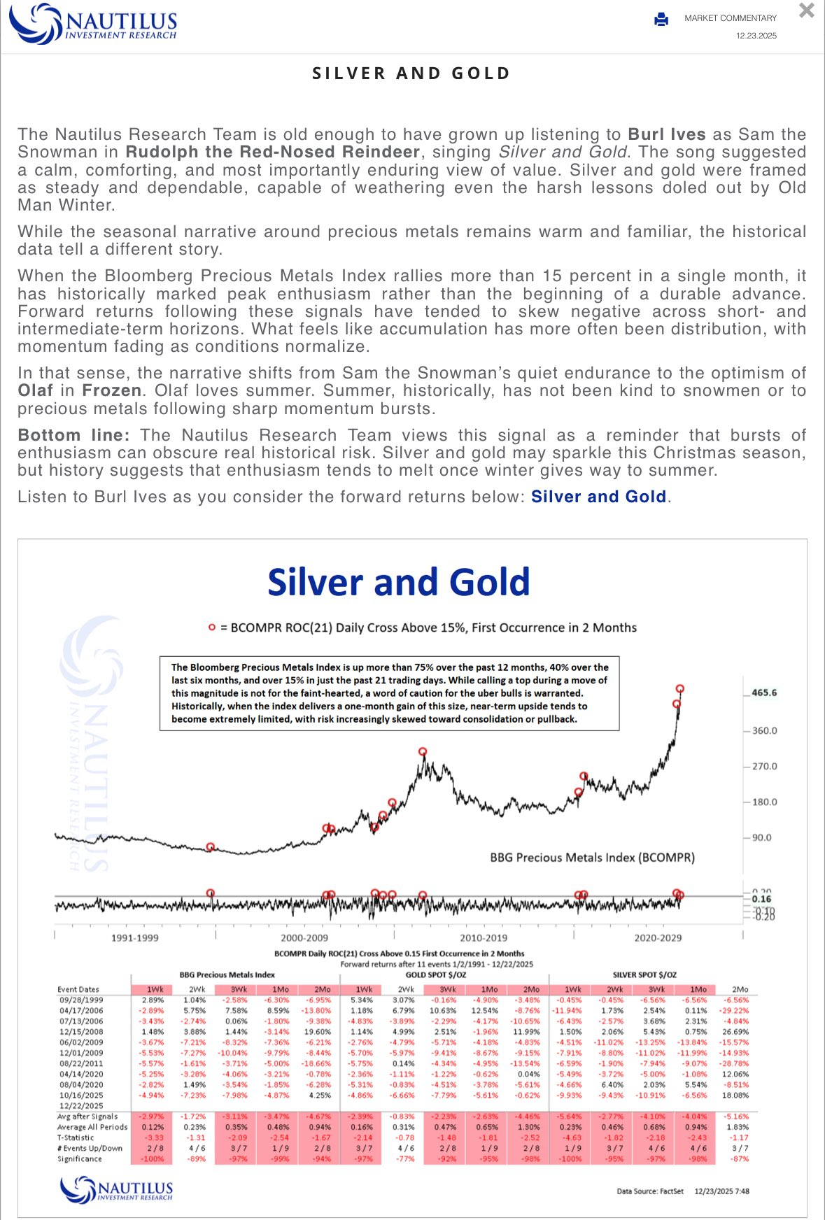 文中有一句非常关键的话:What feels like accumulation has more often been distribution. (你以为是“资金在继续加仓”,实际上更可能是“聪明钱在高位派发”)。Nautilus并没有否定黄金、白银的长期价值,仅提示说明在一个月涨超15%后,风险收益比已经明显恶化。
