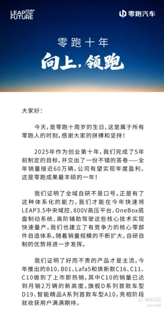今天是 $零跑汽车(09863)$ 零跑 10 周岁生日。年销近 60 万、有望实现年度盈利,创始人朱江明在今天发布的内部信中,把今年定义为「零跑成果最丰硕的一年」。