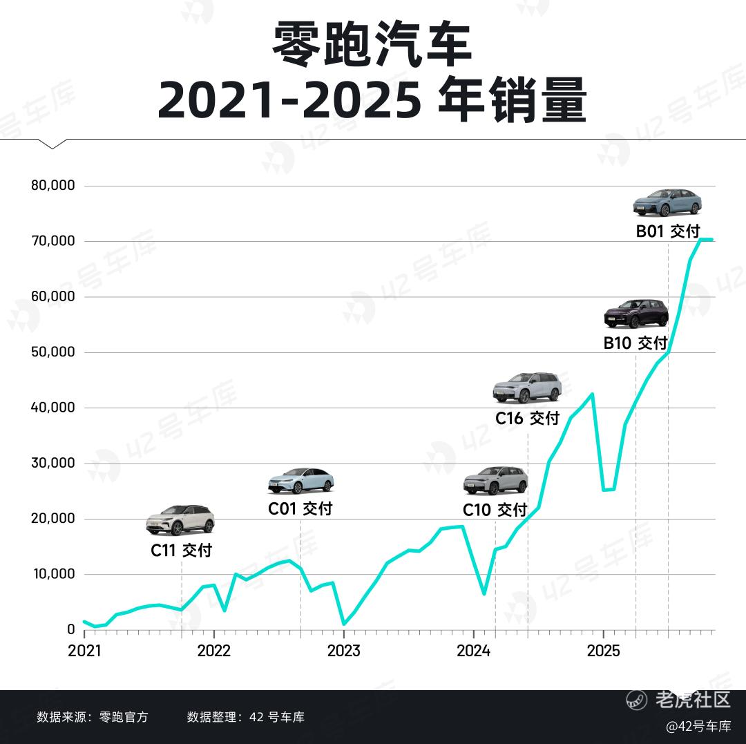 销量走势说明了一切:进入 2025 年后,零跑连续九个月保持增长,11 月单月交付突破 7 万辆;在更长的时间维度里,C10 与 C16 成为了推动零跑从几千台到几万台再到数十万台的关键节点。