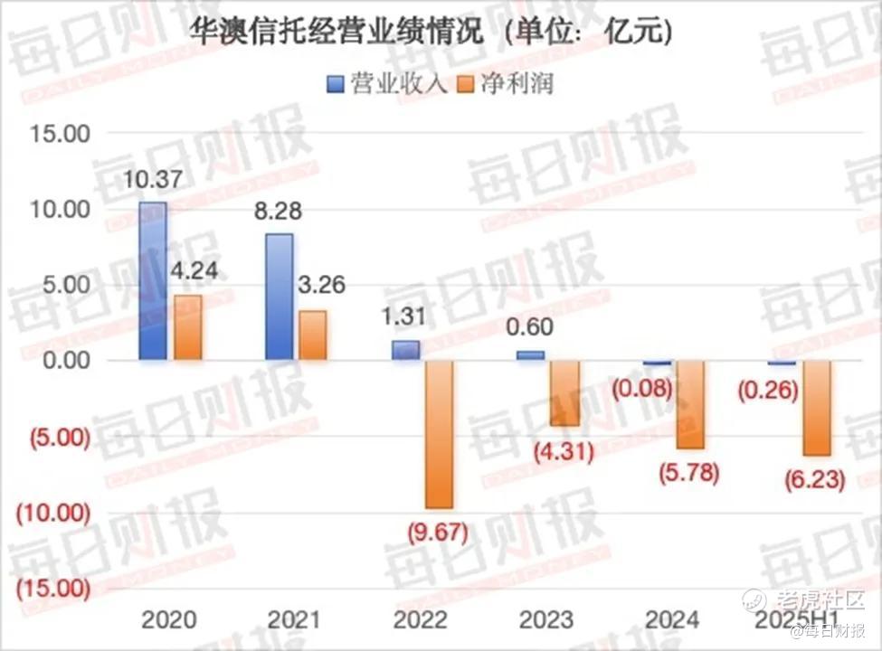 从经营层面来看,华澳信托身上的包袱可以说是很大的,业绩持续承压。数据显示,2020年至2024年五年间,华澳信托营业收入从10.37亿元暴跌至-815.92万元,净利润从4.24亿元跌至-5.78亿元,尤其是在2022-2024年间,华澳信托连续出现大额亏损,净利润分别为-9.67亿元、-4.31亿元、-5.78亿元,三年累计亏损19.76亿元。
