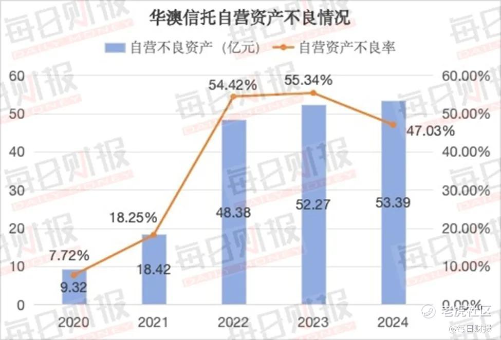 经营业绩急剧承压下,华澳信托的资产质量状况更是令人担忧。其自营资产不良率持续飙升,2020 年至 2023 年分别为 7.72%、18.25%、54.42%、55.34%,虽然在2024年有所压降至47.03%,但也显著位于“高压线”上。