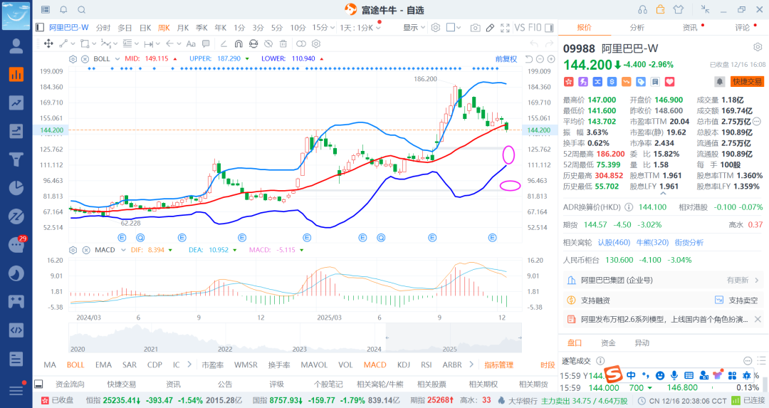 从图上可以看到阿里的调整125/120最少了,好点在110/105附近,低一些就是90/85附近,跌幅还有多少呢,14%-27%-38%,差不多就是15-25-35%附近三个等级了,26年看200+-20附近就差不多了,也就是26年得等回调才能做,追高就接盘了,现在股价起来了,得基本面业绩提升不然就没啥用了。