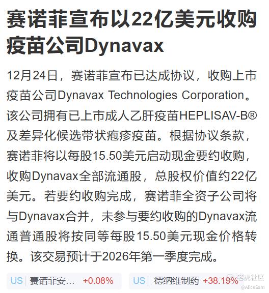 看新闻才知道,赛诺菲昨天2025/12/24正式宣布以每股 15.50美元现金收购 Dynavax,总价约22亿美元。DVAX被赛诺菲22亿美元收购,股价已经起飞了,现在还能不能上车?