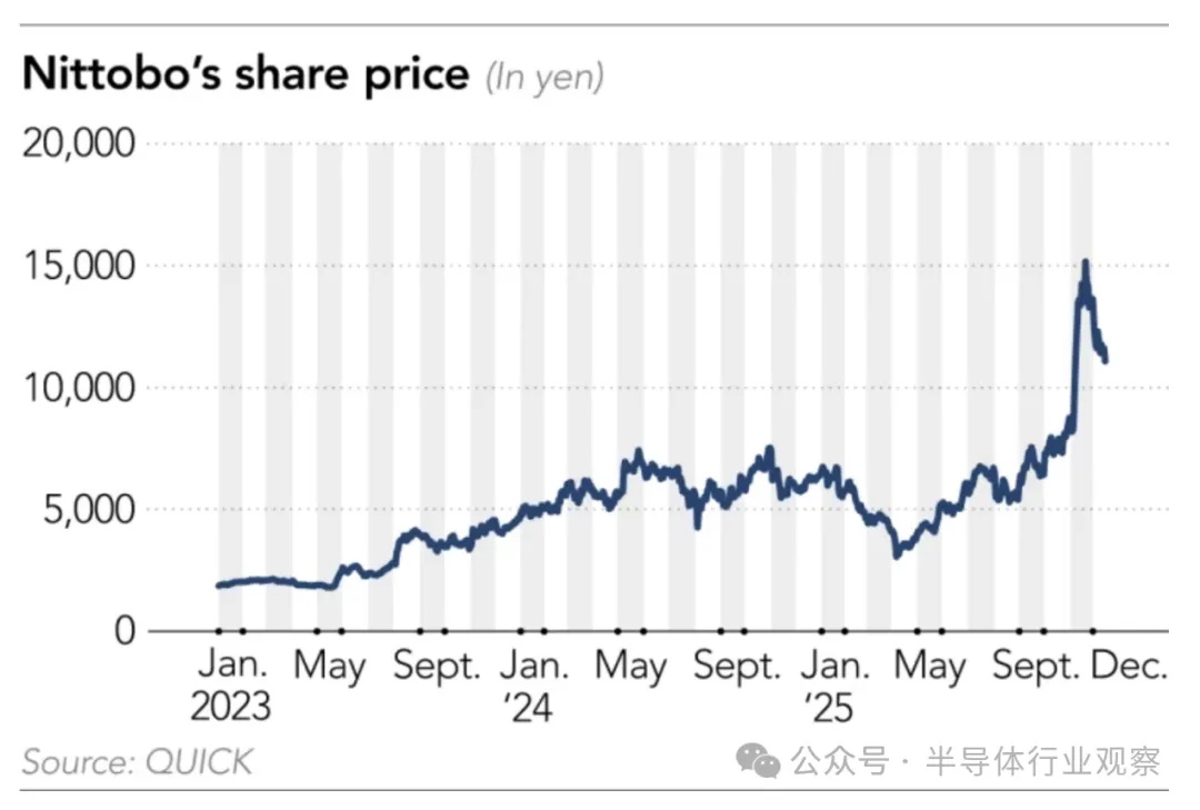 在11月6日的财报电话会议上,日东纺不仅上调了全年盈利预期,还暗示将提前实施产能扩张计划。受此消息提振,其股价在接下来的两周内翻了一番,并在11月20日创下16150日元的历史新高。随后,伴随英伟达的下跌,这家公司的股价也稍有回落。但这也不影响他们再过去两年的狂飙。