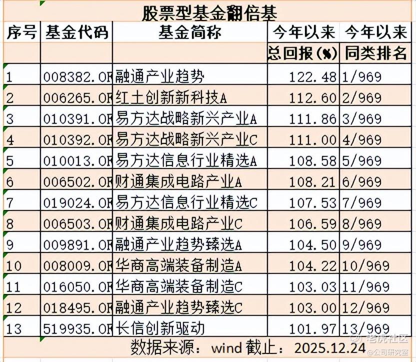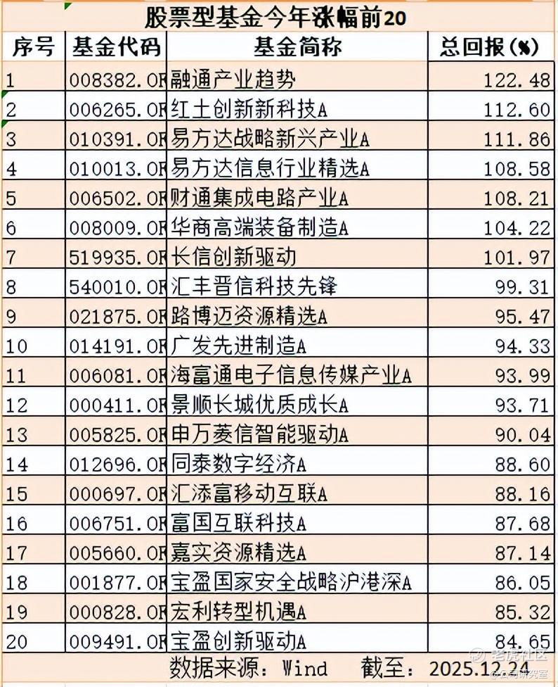 Wind数据显示,截至2025年12月24日收盘,国内有可比业绩的969只股票型基金(同一基金的A、C产品分别计算,下同,特别说明的例外)中,934只业绩为正,占比96.39%;仅35只业绩为负,占比3.61%。