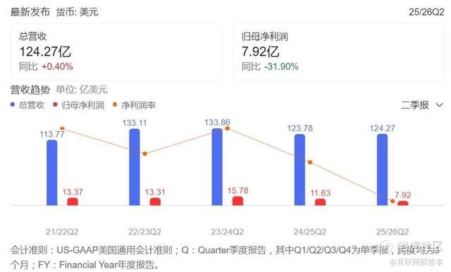 12月19日,耐克披露了其2026财年第二财季财务报告,期内营收124.27亿美元,同比微增0.40%,净利润7.92亿元,同比大跌31.9%。其中,耐克主品牌实现营收121亿美元,同比增长1%,副品牌匡微营收3亿美元,同比下滑30%。