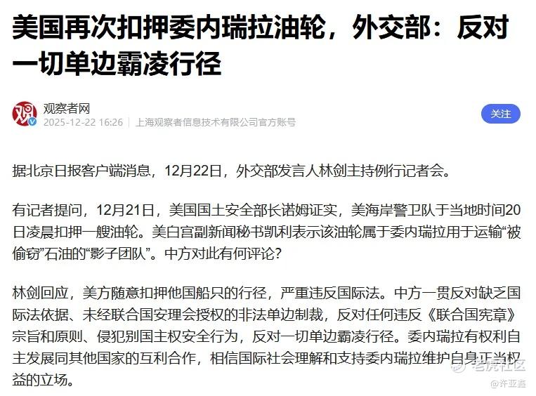 你们可以去做一下世纪号油轮的功课,有些话嘛,我确实不方便在文章里面说,我微信公众号的大号目前还蹲在小黑屋呢,这部分内容,待到我们下一节课的直播课上你们记得提醒我,看我怎么喷老美。咱们官方的表态,如下图: