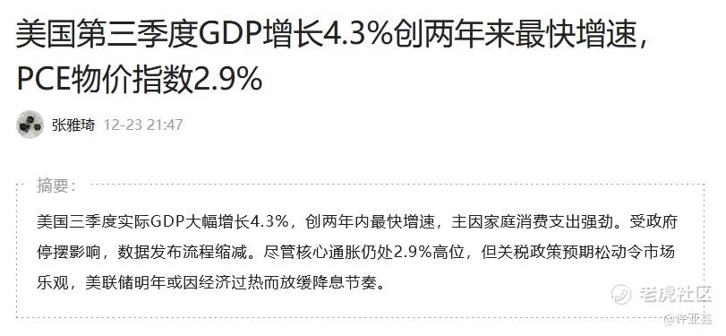 12月23日,美国经济分析局公布的初步数据显示,美国三季度实际GDP年化季环比4.3%,预期 3.3%,前值 3.8%。