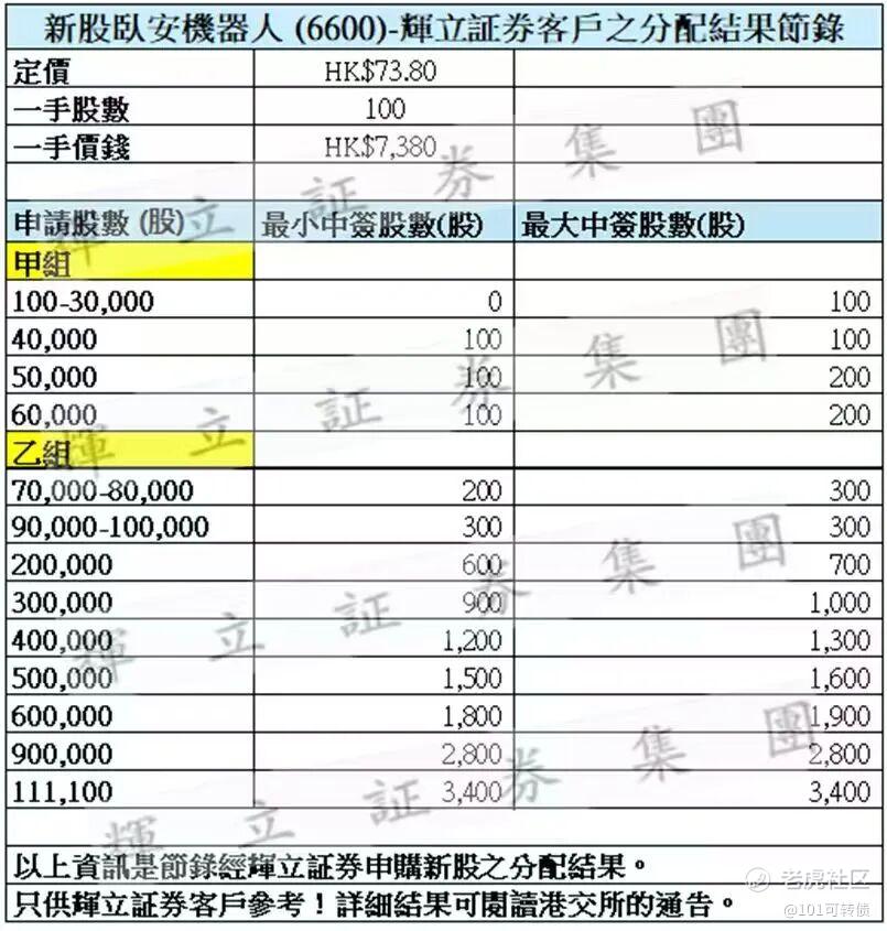 卧安机器人(6600)出分配结果了,400手中1手,甲尾1-2手,乙头2-3手;定价:73.8,偏下限定价,一手100股;具体分析可以看看上一篇文章,只做参考,不做投资买卖建议。