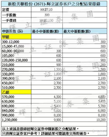 美联股份(2671)出分配结果了,200手稳中1手,甲尾9手,乙头15手;定价:7.10,一手300股;具体分析可以看看上一篇文章,只做参考,不做投资买卖建议。