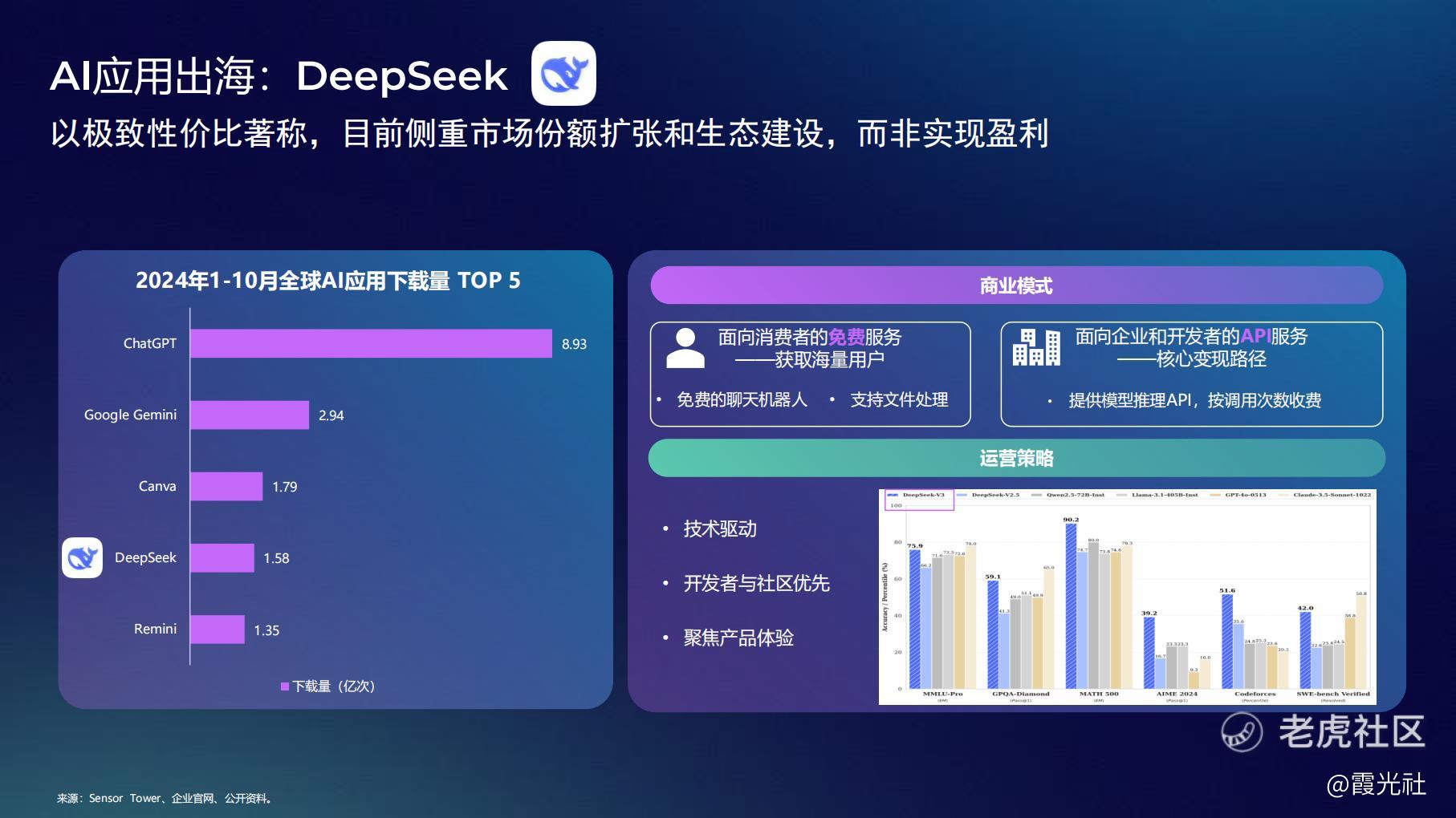 同样作为大语言模型,DeepSeek和豆包虽然位列下载榜第四和第八,但却未能挤进收入榜前十,说明目前变现能力不及ChatGPT,同样不及垂类应用。DeepSeek通过开源模式获客增量,再通过闭源模式的深度服务实现商业变现,目前主要收入来源是API调用,且费用相比ChatGPT较低。