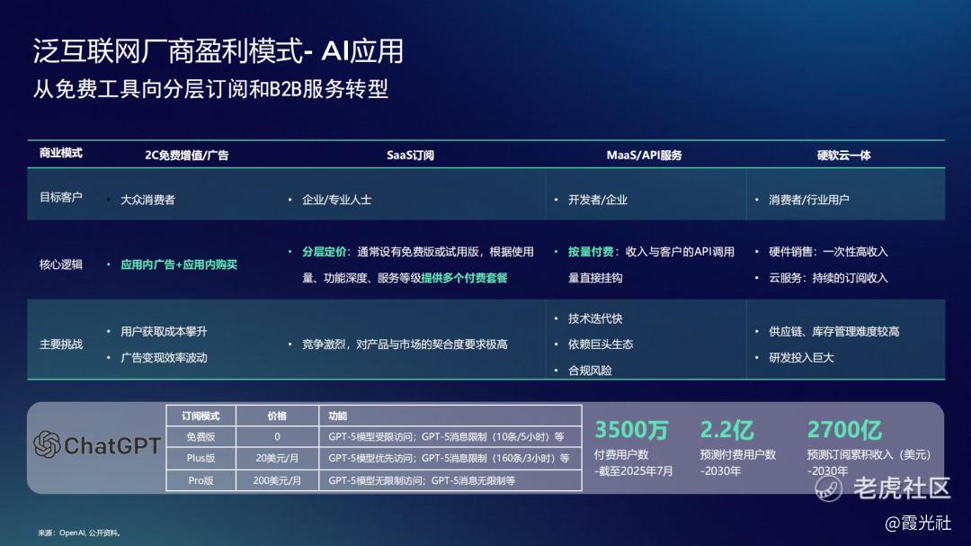 AI的C端应用多通过流量变现和内购收入,B端应用多面向企业及独立开发者,盈利模式通常为SaaS订阅(例如Minimax海螺、快手可灵)和API调用。