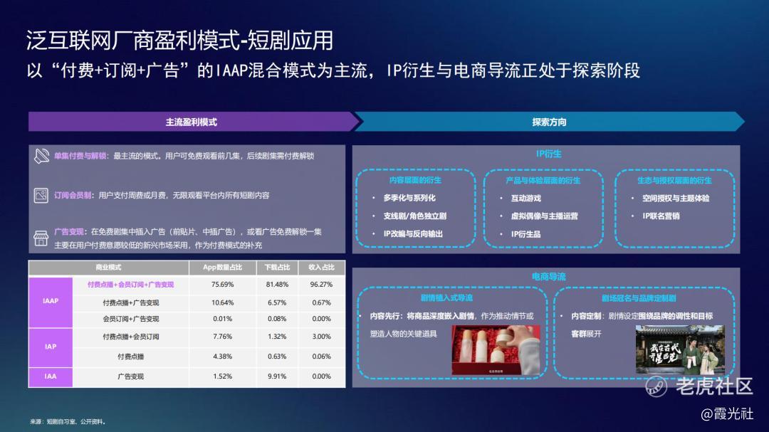 短剧应用前期入局玩家多靠买量获客,但随着流量成本攀高以及转化率降低这一长期不可持续因素,目前80%以上玩家依靠混合变现模式,未来也将进一步探索IP衍生和电商导流模式。