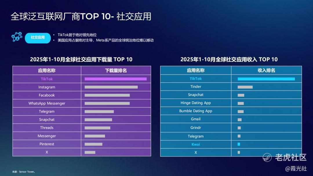 TikTok在社交应用下载和收入榜中均位列第一位,其余9家基本都是美国应用,包括Facebook、Instagram、WhatsApp 等在内的Meta系占绝对主导,此外还有X、Snapchat等,以及俄罗斯即时通讯软件Telegram。