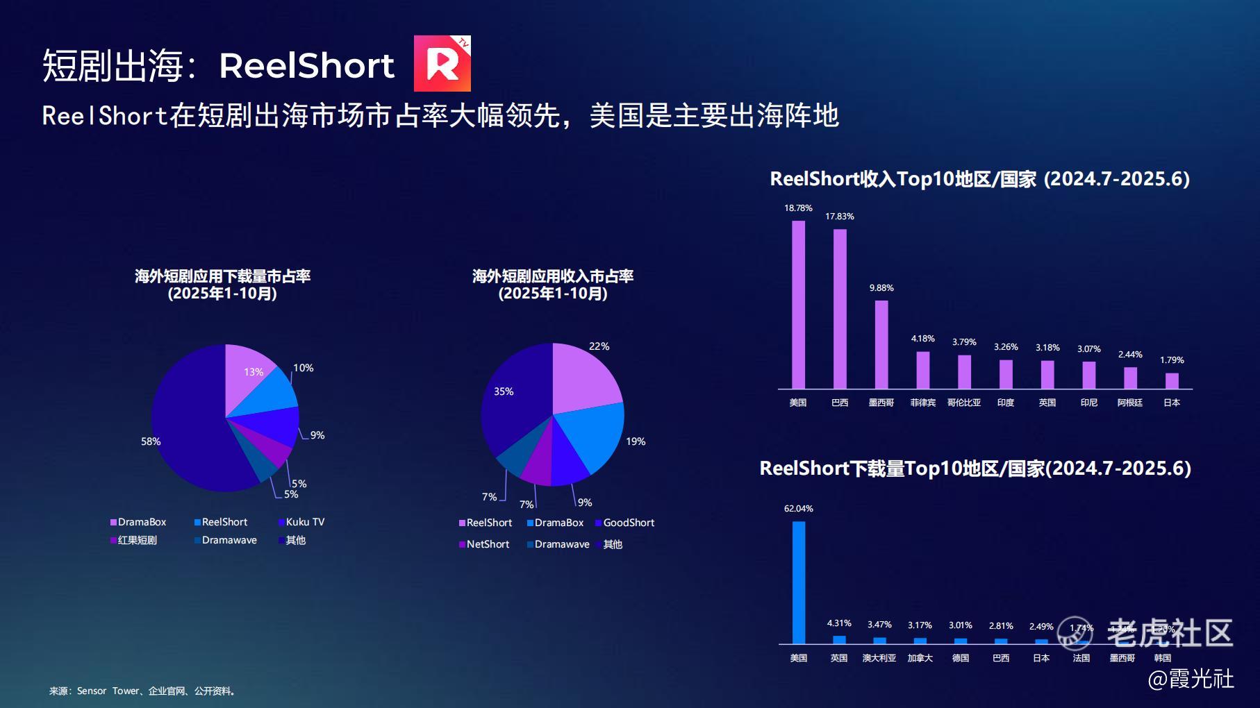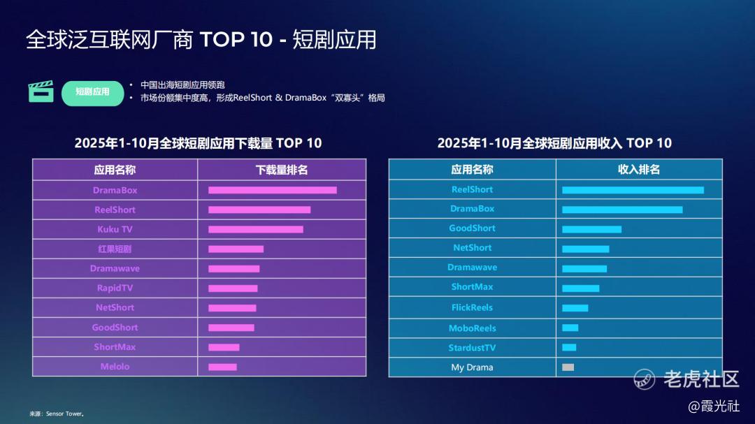 短剧Top10厂商创始团队几乎全部来自中国,多数已实现全球化布局和本地化深耕。Reelshort(中文在线旗下海外应用)和DramaBox(点众科技旗下海外应用)占据“双寡头”格局,下载和收入分别位列第一和第二,收入总计约占全球短剧市场50%。