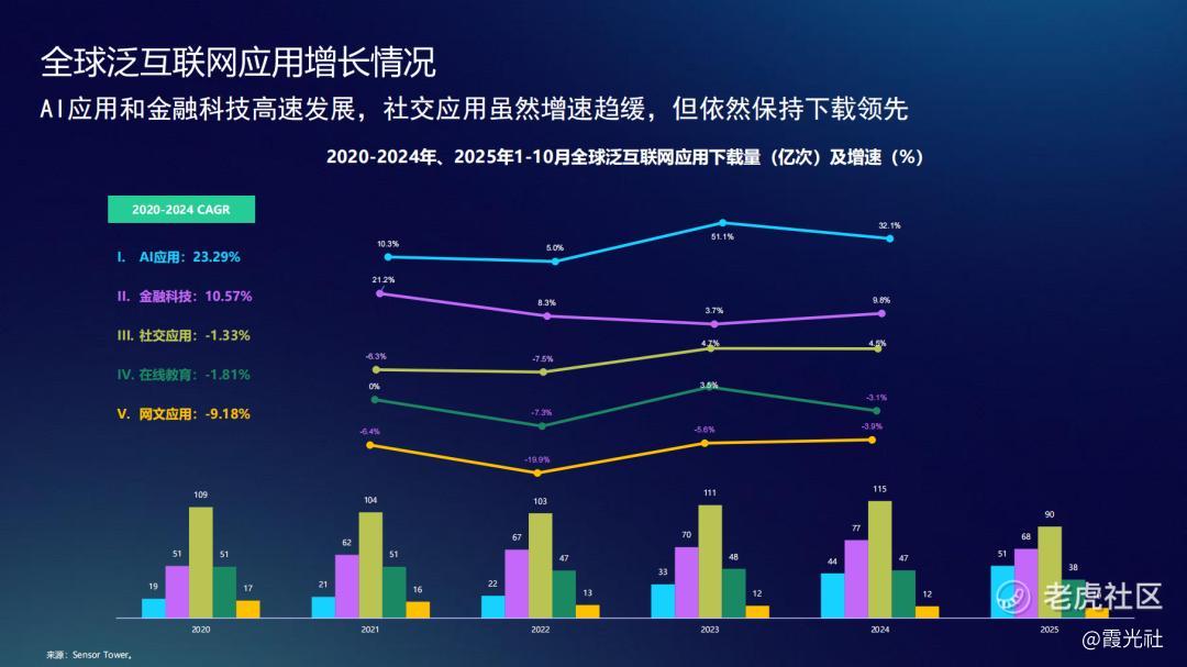 各类互联网应用从下载量来看,除短剧外,AI应用增速最快。短短5年时间,AI应用的下载量从与社交应用相差5倍,逐渐缩小到2倍以内。