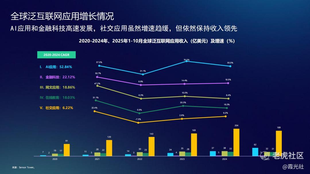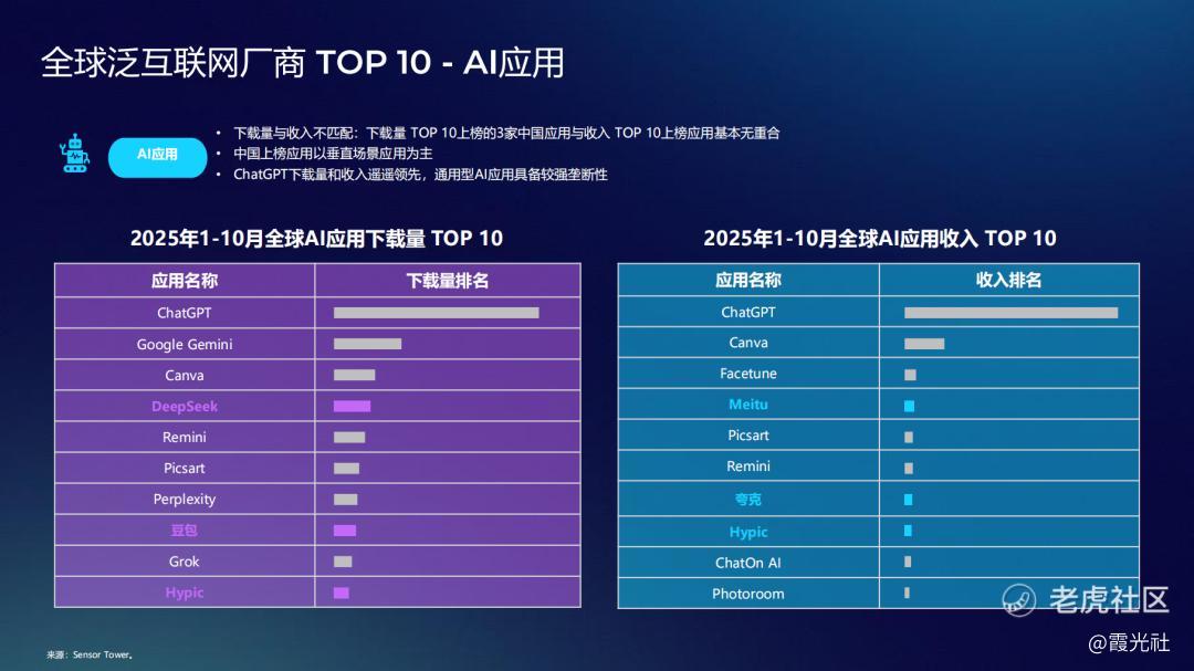 AI应用的收入增长比下载量更加迅猛,5年均复合增长率为52.8%。2025年1-10月AI应用收入为62亿美元,其中仅ChatGPT一家收入占比就超过1/3。