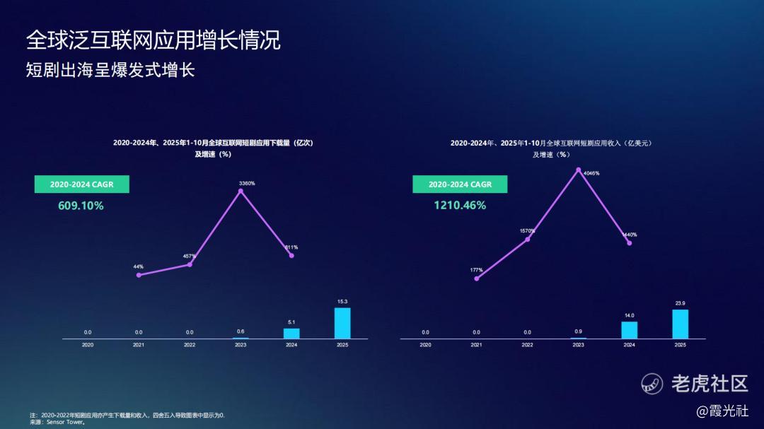 全球短剧近5年实现了爆发式增长,下载量和收入额的5年均复合增长率分别高达609.1%和1210.5%。尤其是在2023年,全球短剧无论是收入还是下载增速均达到峰值,虽然2024年增速开始出现拐点,但仍远超其他应用增速,具备较大增长空间和较强增长潜力。