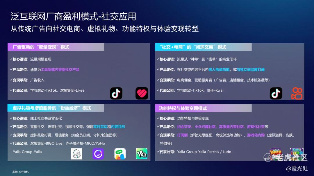 同期也有直播社交(例如Bigo Live)、语音社交(例如赤子城YoHo)、游戏社交(例如Yalla Ludo),通过直播打赏、皮肤、道具、虚拟角色等内购方式实现C端变现及收入分成。