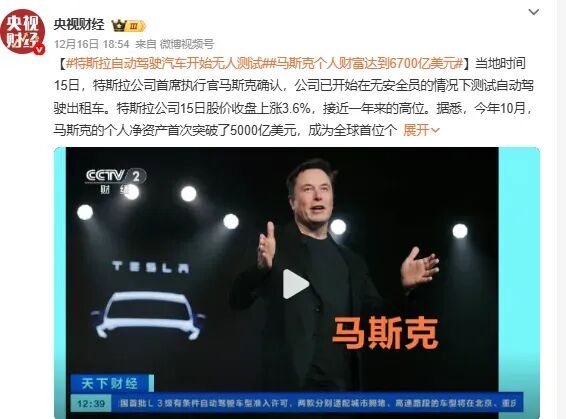 当地时间12月15日,马斯克确认,特斯拉已开始在无安全员情况下测试自动驾驶出租车。