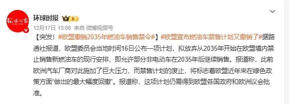 外部最大的变量,是全球电动化政策的转向,曾经被视为铁板一块的“禁燃”时间表,正在松动。