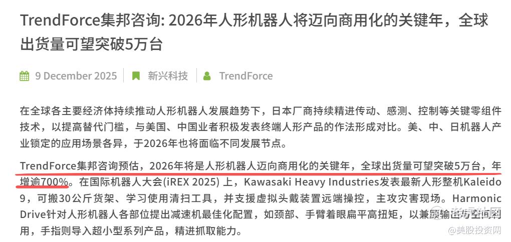 因为这一年,整个行业正迎来一个恐怖的“临界点”。根据 TrendForce 集邦咨询的最新预测,2026 年全球人形机器人的出货量将突破 5万台,同比增速直接拉升到 700% 以上!这标志着机器人正式从实验室的“展示品”,变成了工厂里的“生产工具”。