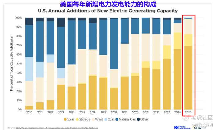 为了填补缺口,光伏成了最快的“急救包”,根据SEIA 的统计,2025 年第一季度太阳能发电占新增电力装机的约 69%,而 FERC 报告显示,截至目前太阳能在新增发电容量中的占比甚至高达 约 75%。