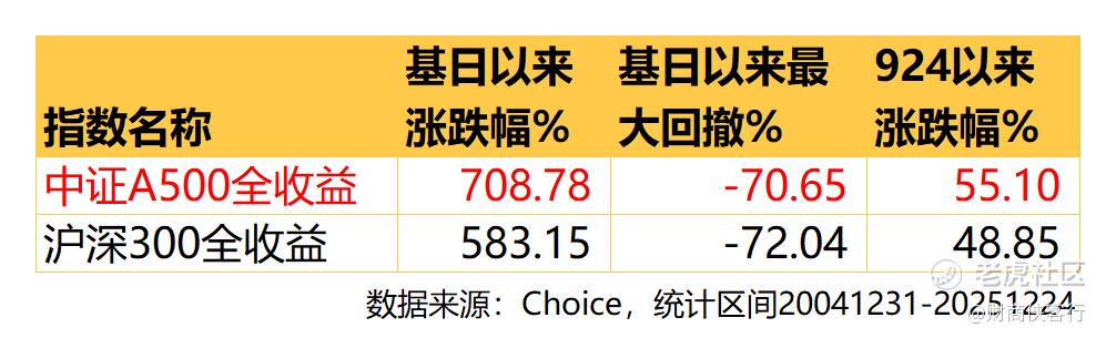 从长期来看,它的业绩相当能打。Choice数据显示,截至2025年12月24日,A500全收益指数累计回报达到708.78%,明显跑赢沪深300全收益指数(583.15%),与此同时,最大回撤却和沪深300相当,收益风险比很突出。