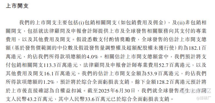按发售价18.30港元计算(发售价中值),公司上市总支出预计约为1.82亿港元、约占所得款项总额的4.0%(假设未行使超额配售权)。其中约0.54亿港元将于综合全面亏损表列支、约1.28亿港元预计将在上市后直接确认为权益扣减,人民币0.34亿元已在综合全面亏损表列支出。