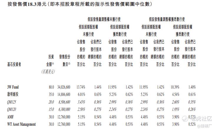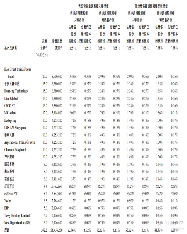 本次发行拥有23名基石投资者,分别为3W Fund、Aspex Master Fund、WT Asset Management、Huadeng Technology、Lion Global、MY Asian、Eastspring、UBS AM Singapore、Aspirational China Growth、Charoen Pokphand、Yeebo、EIP、Tessy Holding Limited、New Opportunities SPC、启明创投、Hao Capital、平安人寿保险、景林、泰康人寿、神州数码、国泰君安、南方基金以及富国基金合计认购28.99亿港元,按发售价每股18.30港元(按发售价中值计算),基石投资者认购的发售股份总数为158,435,200股,约占根据全球发售发行的发售股份的63.96%(假设超额配股权未获行使)。Lion Global资产规模达609亿美元,启明创投的资产管理规模超95亿美元。