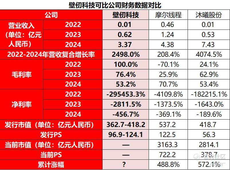 壁仞科技的发行市值为362.7-418.2亿元,均小于摩尔线程的537.2亿元,沐曦股份的418.7亿元,截至目前,摩尔线程当前市值为3163.3亿元,累计涨幅约488.8%倍,沐曦股份当前市值为2814.1亿元,累计涨幅约572.1%,上市后两家公司均出现明显涨幅,尽显国产 GPU 赛道的超强成长性,壁仞科技的发行ps处于摩尔线程与沐曦股份之间,依托其核心优势的高端算力芯片的技术积累与高营收复合增长率,后续通过持续推进算力芯片的商业化落地、扩大客户覆盖以提升营收规模,同时优化研发成本管控以加快亏损收窄节奏上市后有望借力行业东风,迎来估值的飞速发展。