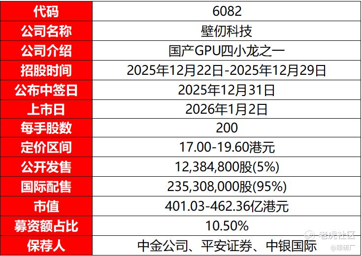 从市场情绪方面来看,截至发稿,壁仞科技的公配超购704.12倍,根据机制18C,公开配售会调整到20%,投资者的中签概率会有所增加增加,近期同类A1算力及基础设施公司不断上市,同为国产GPU四小龙之一的摩尔线程上市首日涨幅超425%,目前市值达3,163.3亿元、沐曦股份上市首日涨幅更是超690%,市值达2,814.1亿元,充分体现出公司所在行业的成长潜力以及市场的火热,感兴趣的小伙伴可以留意后面几天的申购情况。