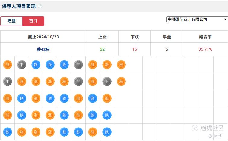 中银国际历史上作为保荐人共参与42个项目,暗盘17家公司上涨,7家公司下跌,18家公司平盘,破发率为16.67%;上市首日22家公司上涨,15家公司下跌,5家公司平盘,破发率35.71。保荐人在暗盘项目破发率相对较低。