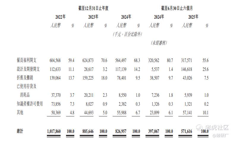 壁仞在研发方面一直以来投入大量资源,从2022年至2025年上半年,公司分别产生研发开支人民币10.18亿元、8.86亿元、8.27亿元及5.72亿元,员工福利开支始终是研发开支的最大单一组成部分该类开支分别占研发开支总额的59.4%、70.6%、68.3%及55.6%。其中设计及开发开支由2022年的人民币1.13亿元减少至2023年的0.29亿元,主要因2023年流片成本较低;2024年增至1.17亿元,核心驱动因素为当年新产品及新解决方案设计服务费增加,截至2025年上半年突增至1.47亿元,主要由于用于BR166等新产品开发的设计服务费(以NRE解决方案为主)增加。