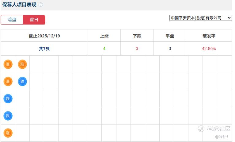 平安证券历史上作为保荐人共参与7个项目,暗盘3家公司上涨,4家公司下跌,0家公司平盘,破发率为57.15%;上市首日7家公司上涨,3家公司下跌,0家公司平盘,破发率42.86%。