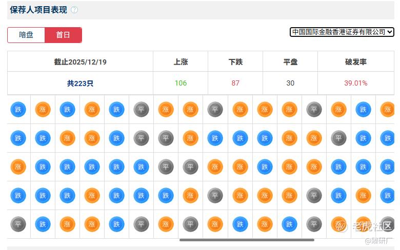 中金公司历史上作为保荐人共参与223个项目,暗盘101家公司上涨,96家公司下跌,26家公司平盘,破发率为43.05%;上市首日106家公司上涨,87家公司下跌,30家公司平盘,破发率39.01%。