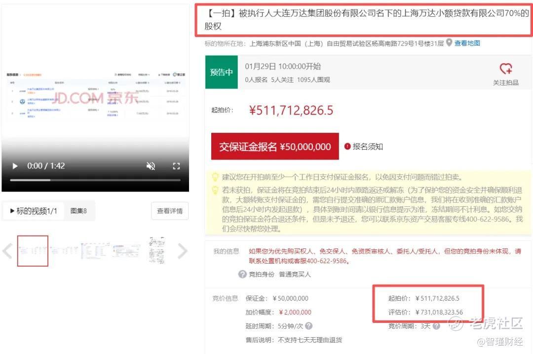 近日,在京东拍卖交易平台,上海万达小额贷款有限公司(下称万达小贷)70%股权拍卖正在预告。