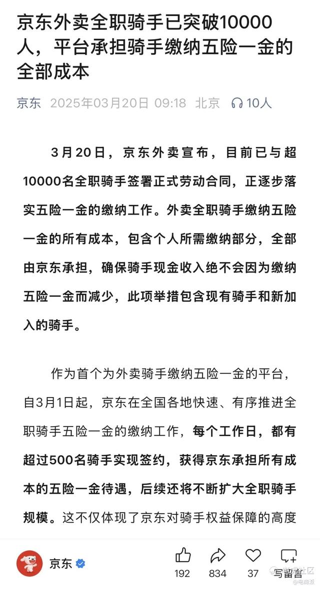 此外,京东还为全职骑手缴纳五险一金,这在行业内尚属首例。这种做法不仅夯实了平台的服务根基,更能提升骑手队伍的稳定性,进而带动服务质量的提升。